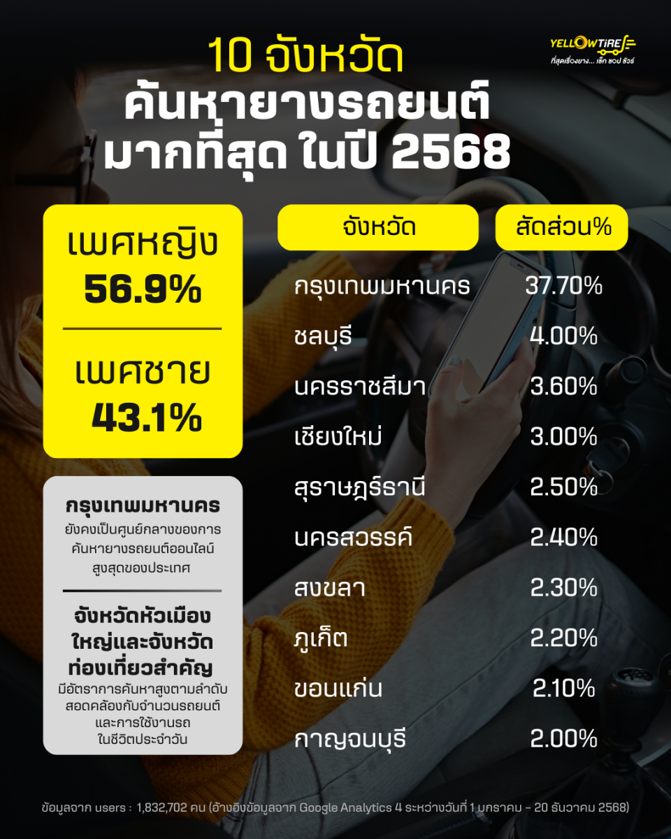 YellowTire.com เผยข้อมูลสถิติการค้นหายางรถยนต์ออนไลน์ ประจำปี 2568 จากผู้ใช้งานจริงบนแพลตฟอร์ม รวมกว่า 1,832,702 คน (อ้างอิงข้อมูลจาก Google Analytics 4 ระหว่างวันที่ 1 มกราคม – 20 ธันวาคม 2568) สะท้อนพฤติกรรมผู้ใช้รถยนต์ทั่วประเทศที่หันมาเลือกซื้อและค้นหาข้อมูลยางรถยนต์ผ่านช่องทางออนไลน์มากขึ้นอย่างต่อเนื่อง